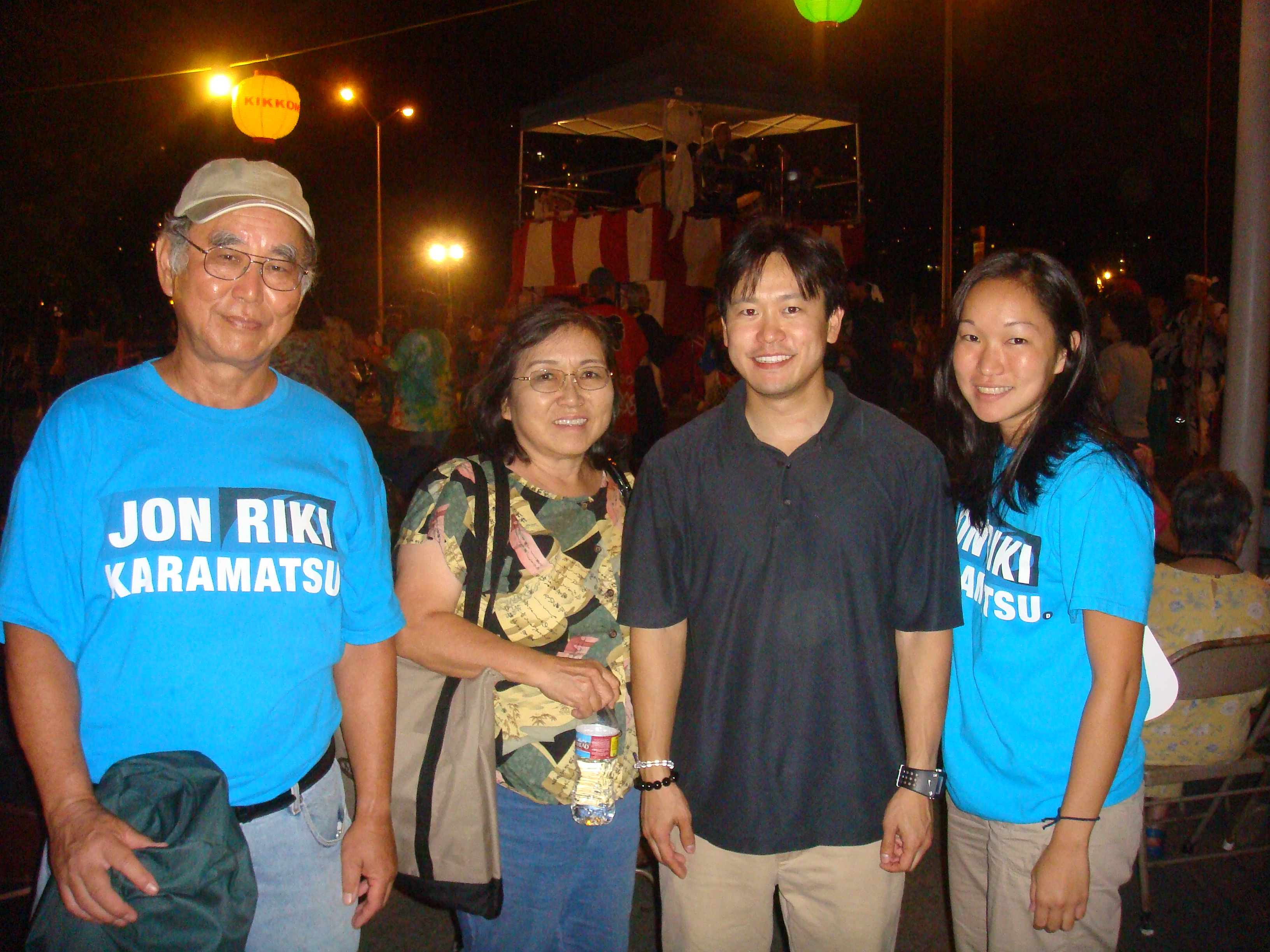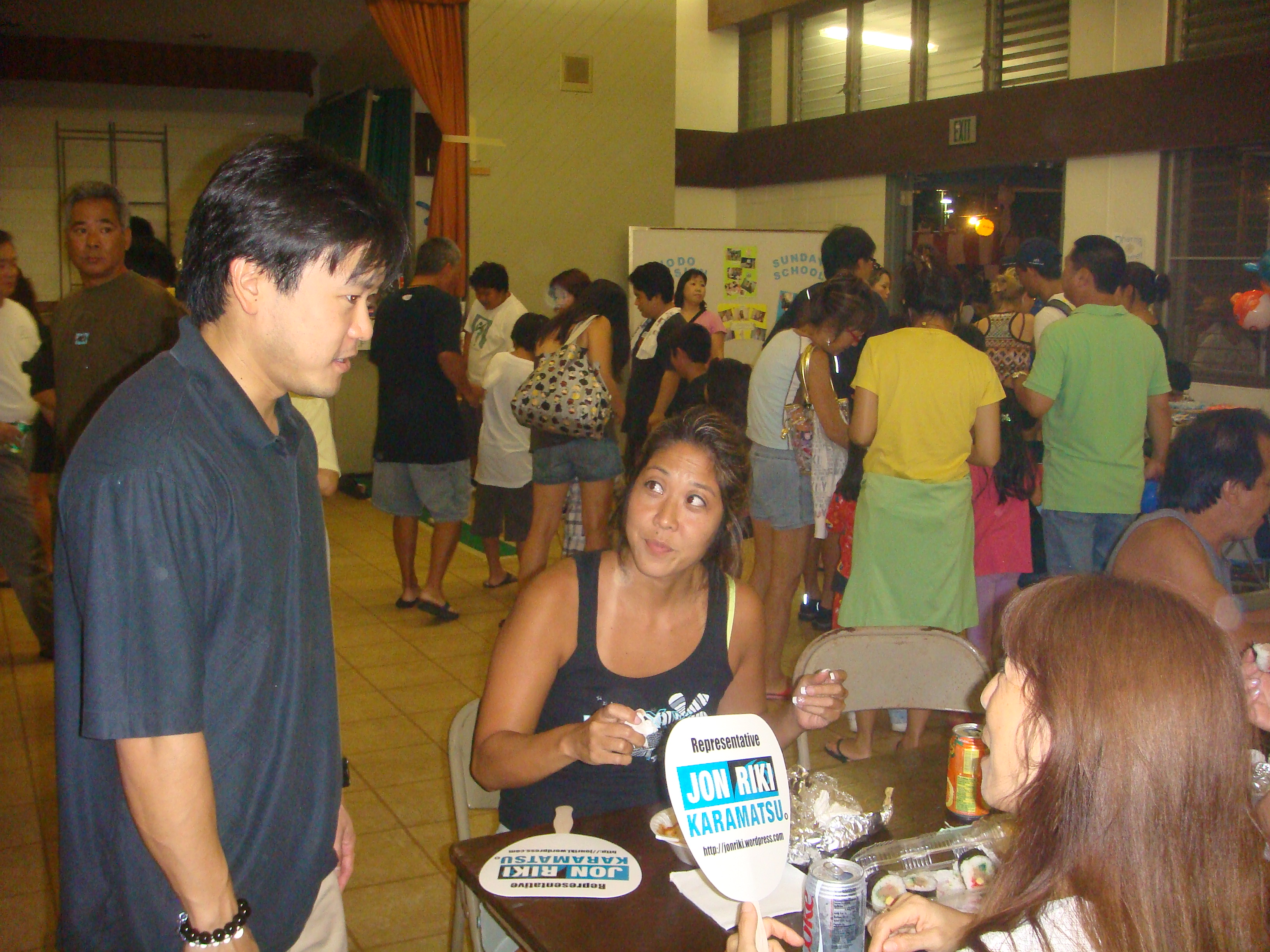 I attended Jodo Mission of Hawaii’s Bon Dance on August 15, 2009 from 6:15 P.M. to 10:30 P.M. I greeted as many people as I could and helped clean up. Fourteen friends and family in my campaign team cooked barbecue sticks or helped the bon dance in other areas. Ian Kitajima, Brandon Mistuda, Scott Murakami, and I are on the board of directors for Jodo Mission of Hawaii. I saw Senator Carol Fukunaga volunteering at a food booth again.