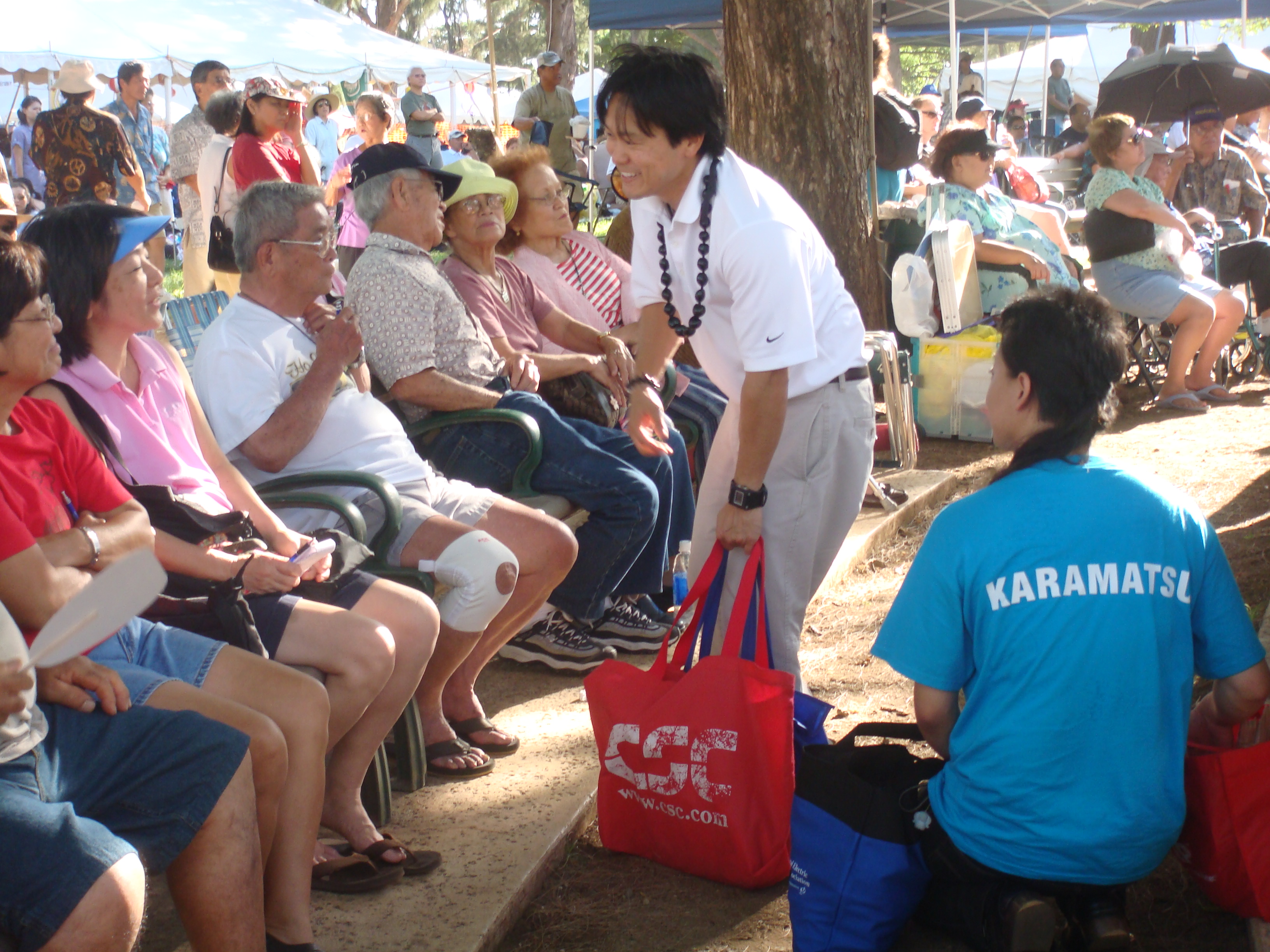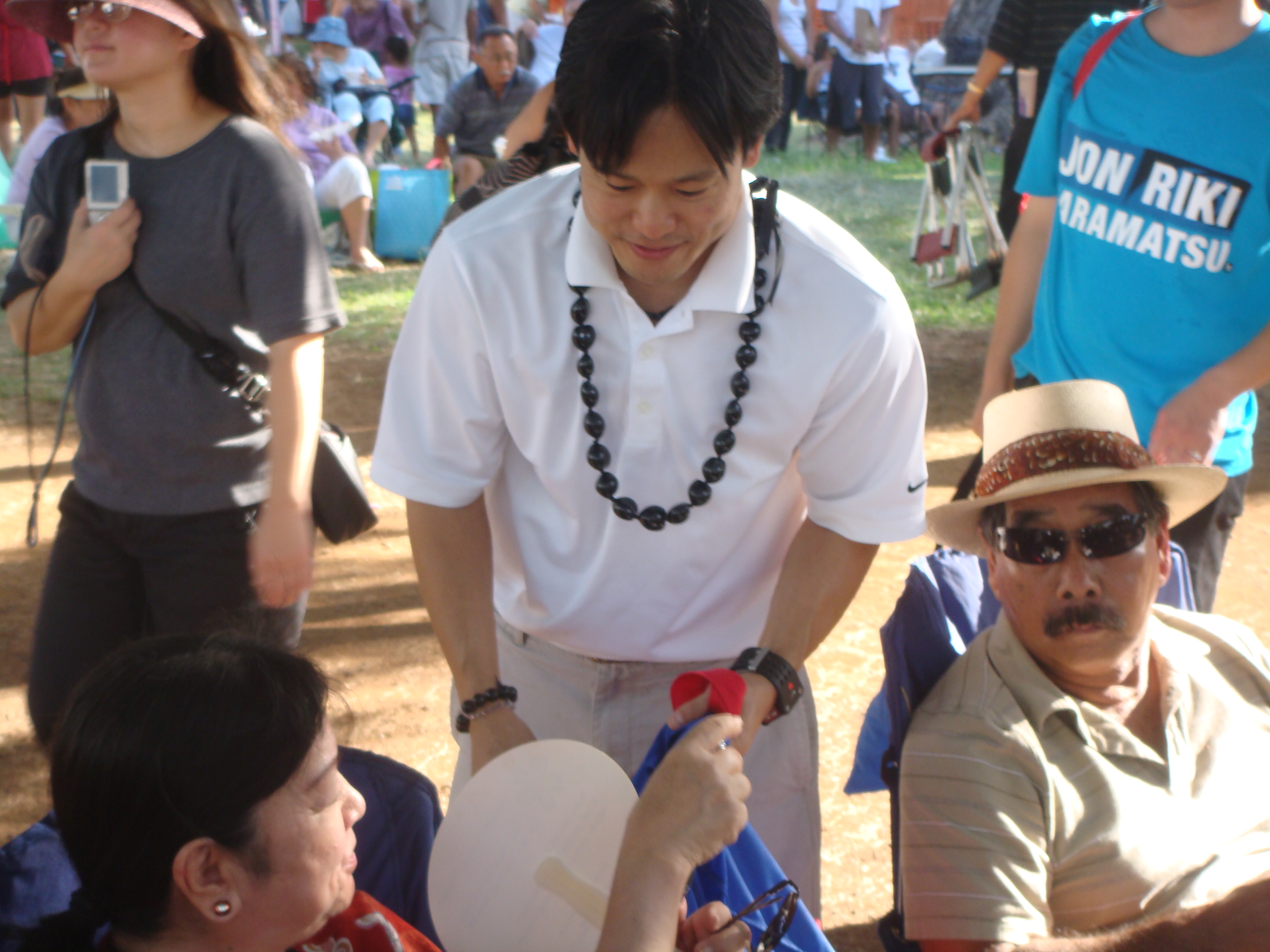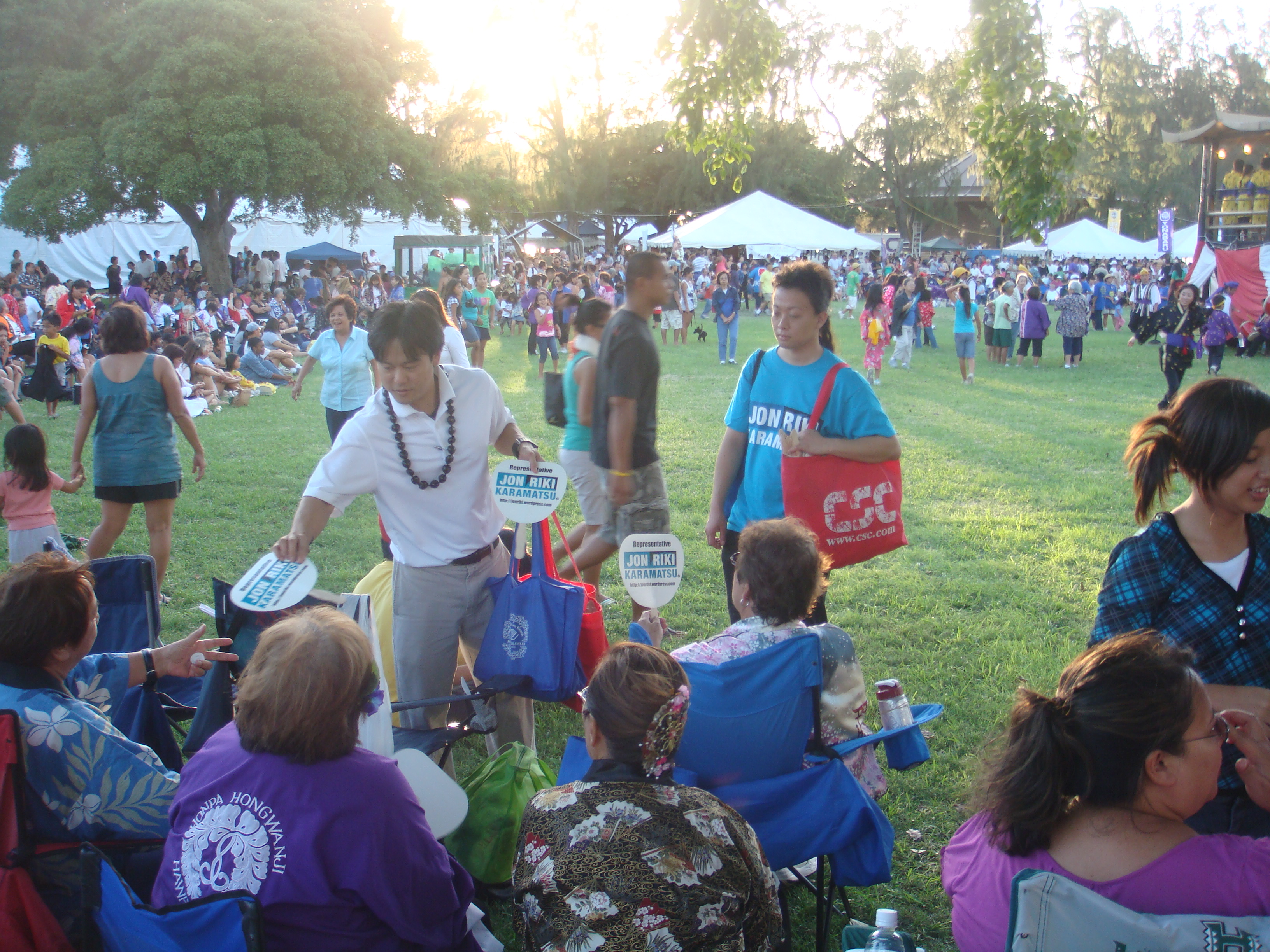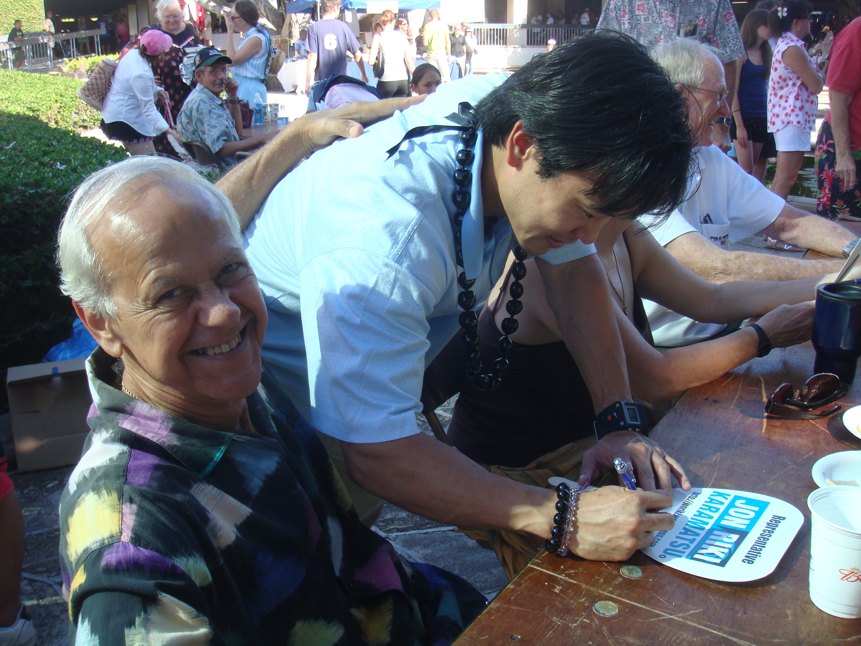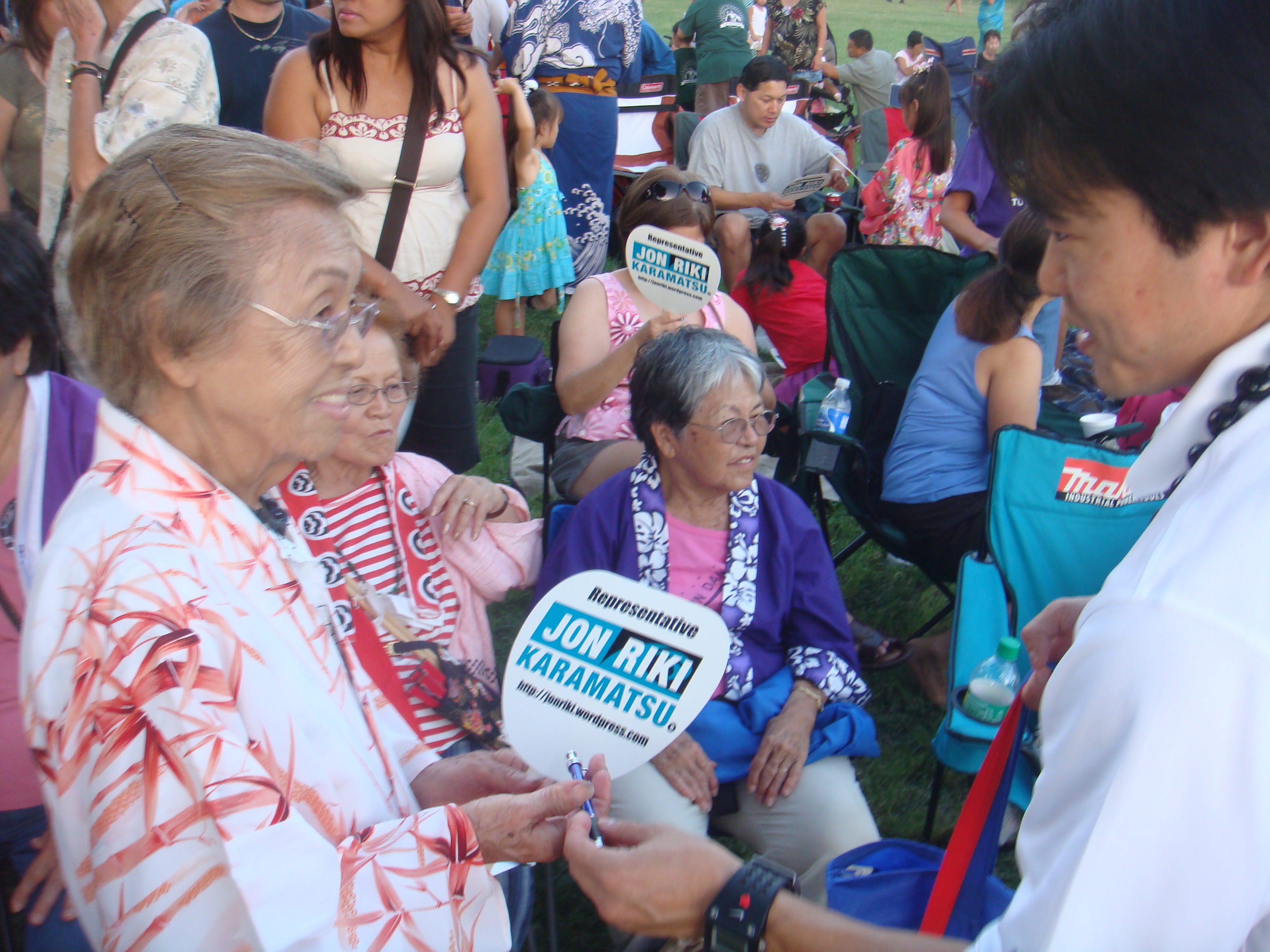 Recently a number of seniors at the Senior Fair told me, “Thank you for running.” I told them, “No, thank you for all you have done for my generation so we can can go to public school and do well.” I will never forget the look on their faces. The were touched and some of their eyes welted up a little. My eyes got teary but I held them in. The most touching was at the Okinawan Festival when en elder AJA lady started to cry when I knelt before her and gave her my pen.