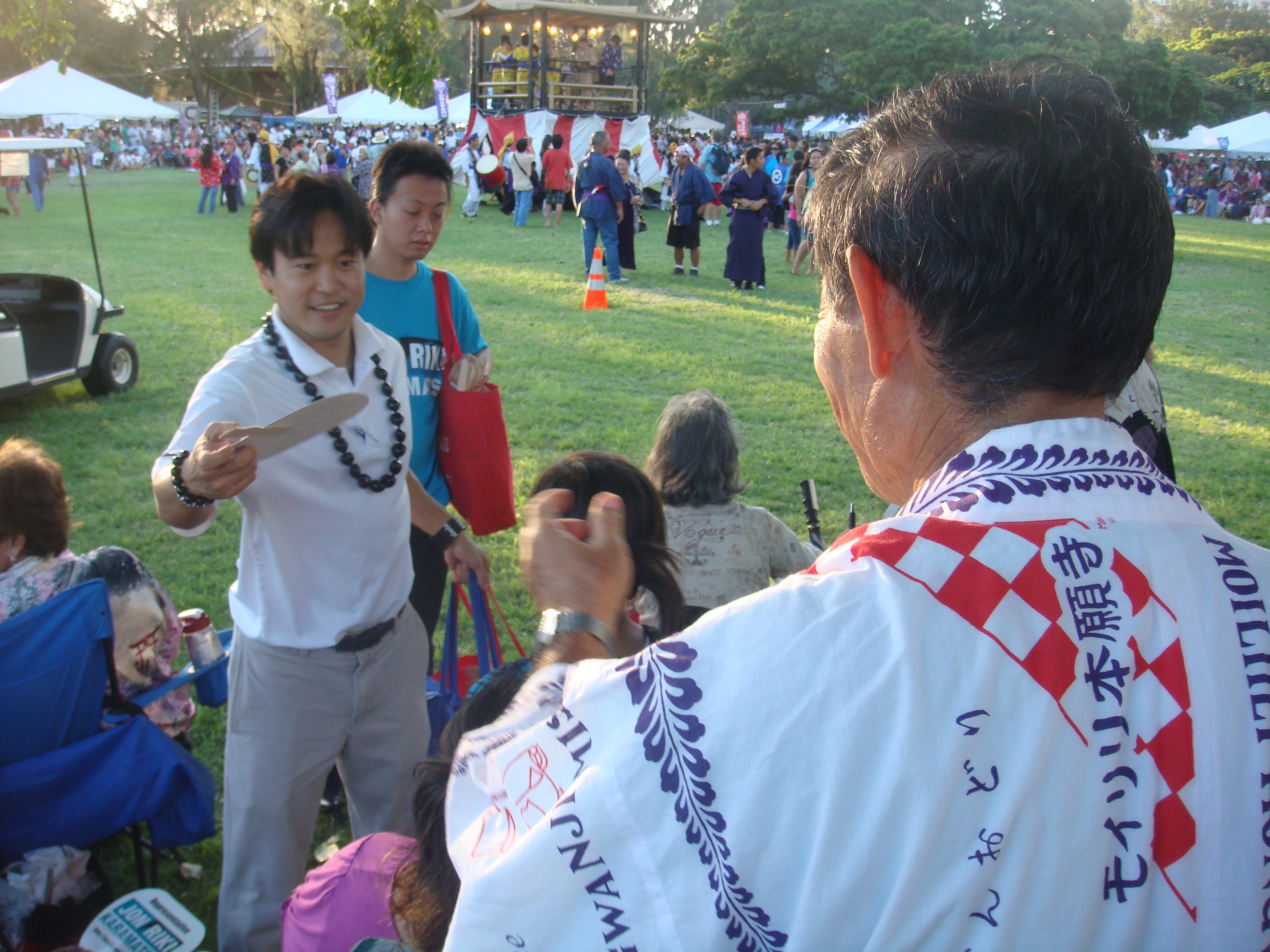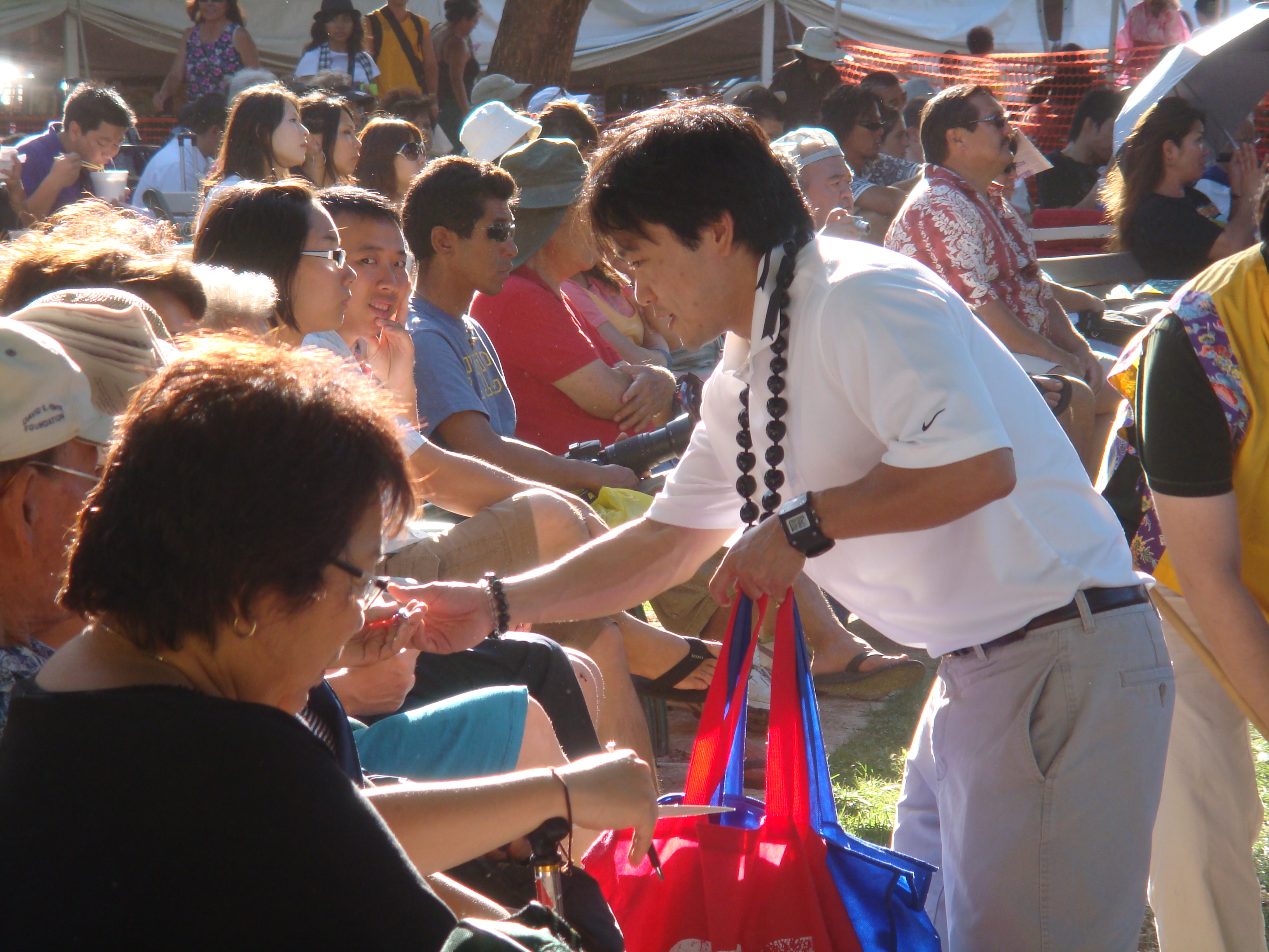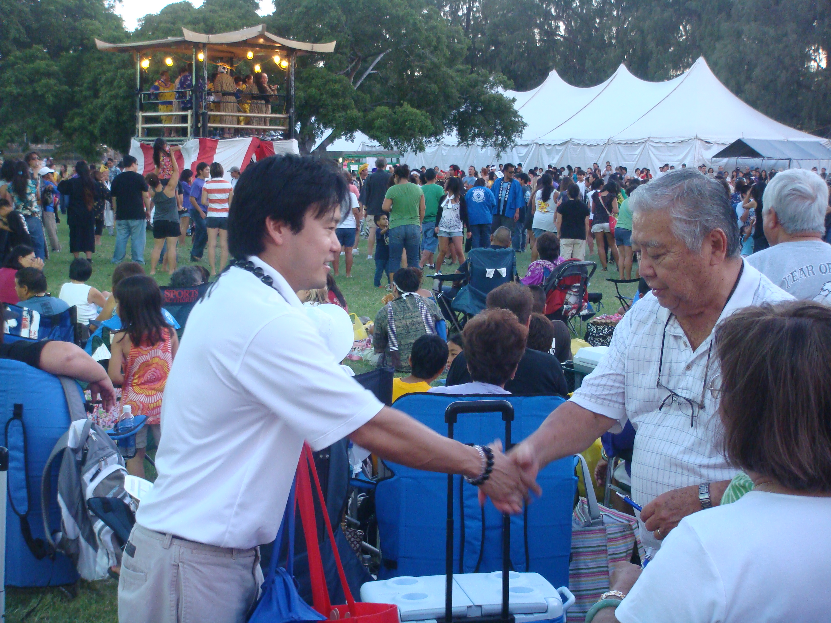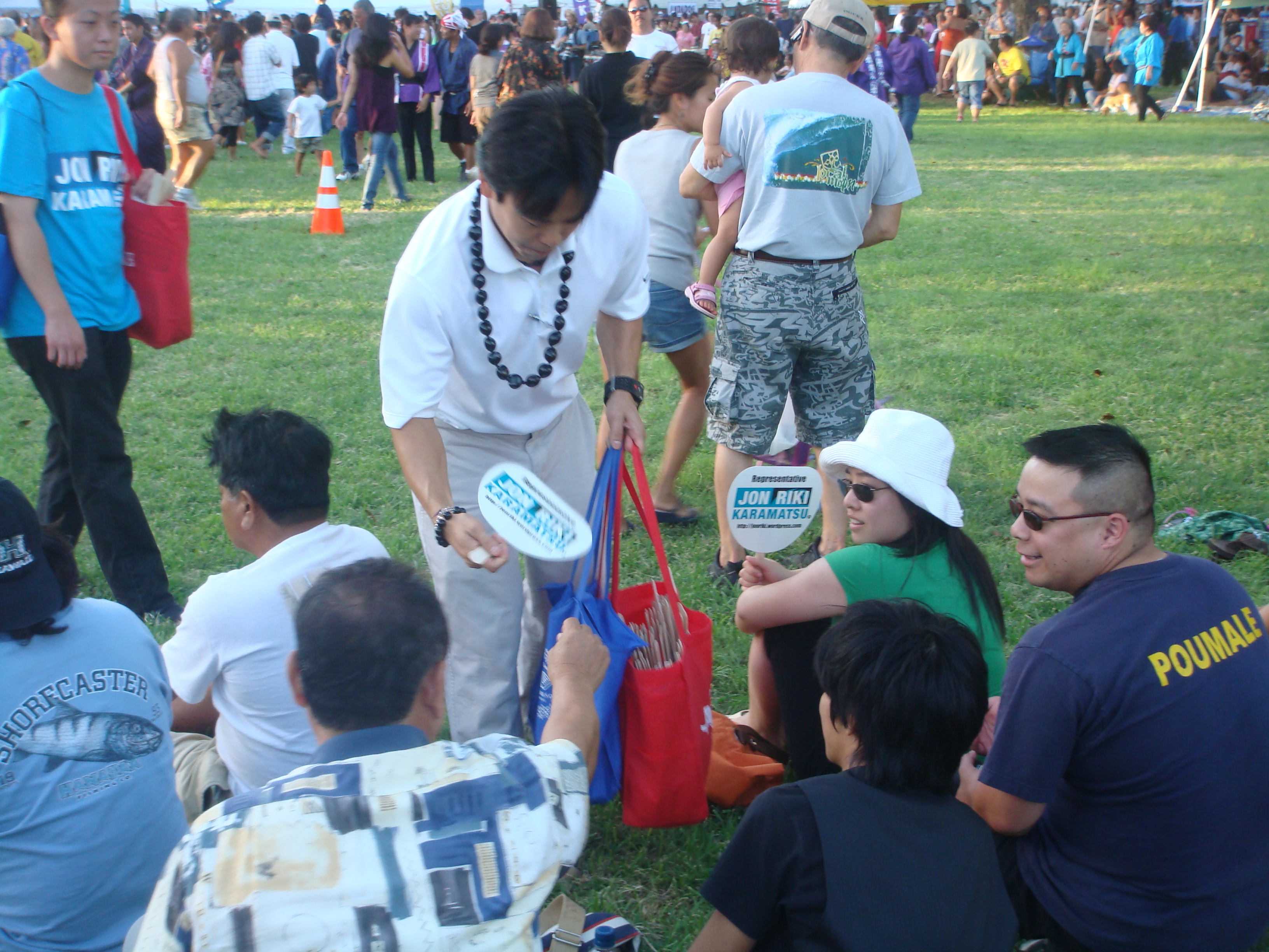 Recently a number of seniors at the Senior Fair told me, “Thank you for running.” I told them, “No, thank you for all you have done for my generation so we can can go to public school and do well.” I will never forget the look on their faces. The were touched and some of their eyes welted up a little. My eyes got teary but I held them in. The most touching was at the Okinawan Festival when en elder AJA lady started to cry when I knelt before her and gave her my pen.