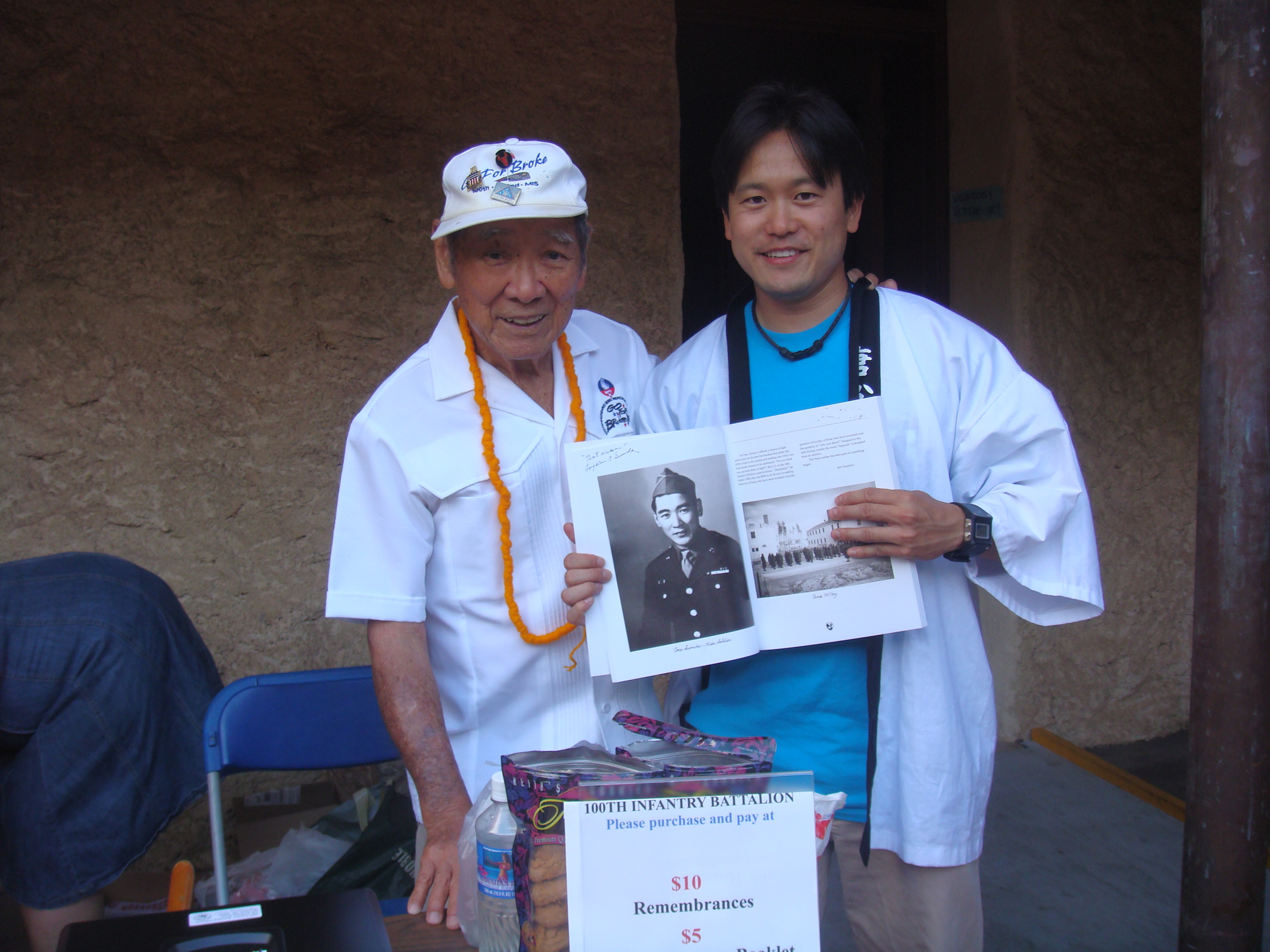 I am with my friend Goro Sumida of the 100th Infantry Battalion. One of my favorite memories with him was a night before one of the anniversary dinners honoring the 100th and 442 in I believe 2007. I was with Goro, Robert Arakaki, and the veterans drinking and singing karaoke at Hanagasa Inn. When I sang, “Shimauta” they went nuts, cheering and some of them dancing along side a couple of waitresses. At a get-together recently, he told me, “You know why we are alive? Because we were not afraid to die. You could die anytime. That’s why we went go for broke. Even now, you can die anytime.”