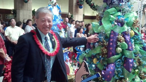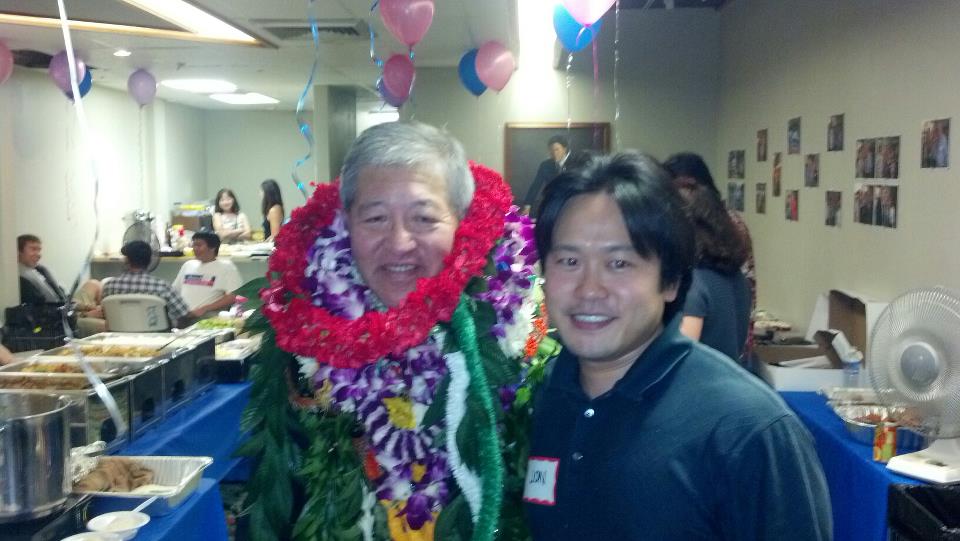 100th Battalion Veteran Leighton “Goro” Sumida with Jon Riki Karamatsu on June 6, 2012 at an event at Iolani Palace. Goro signed his picture for Jon in a book on the 100th Battalion.