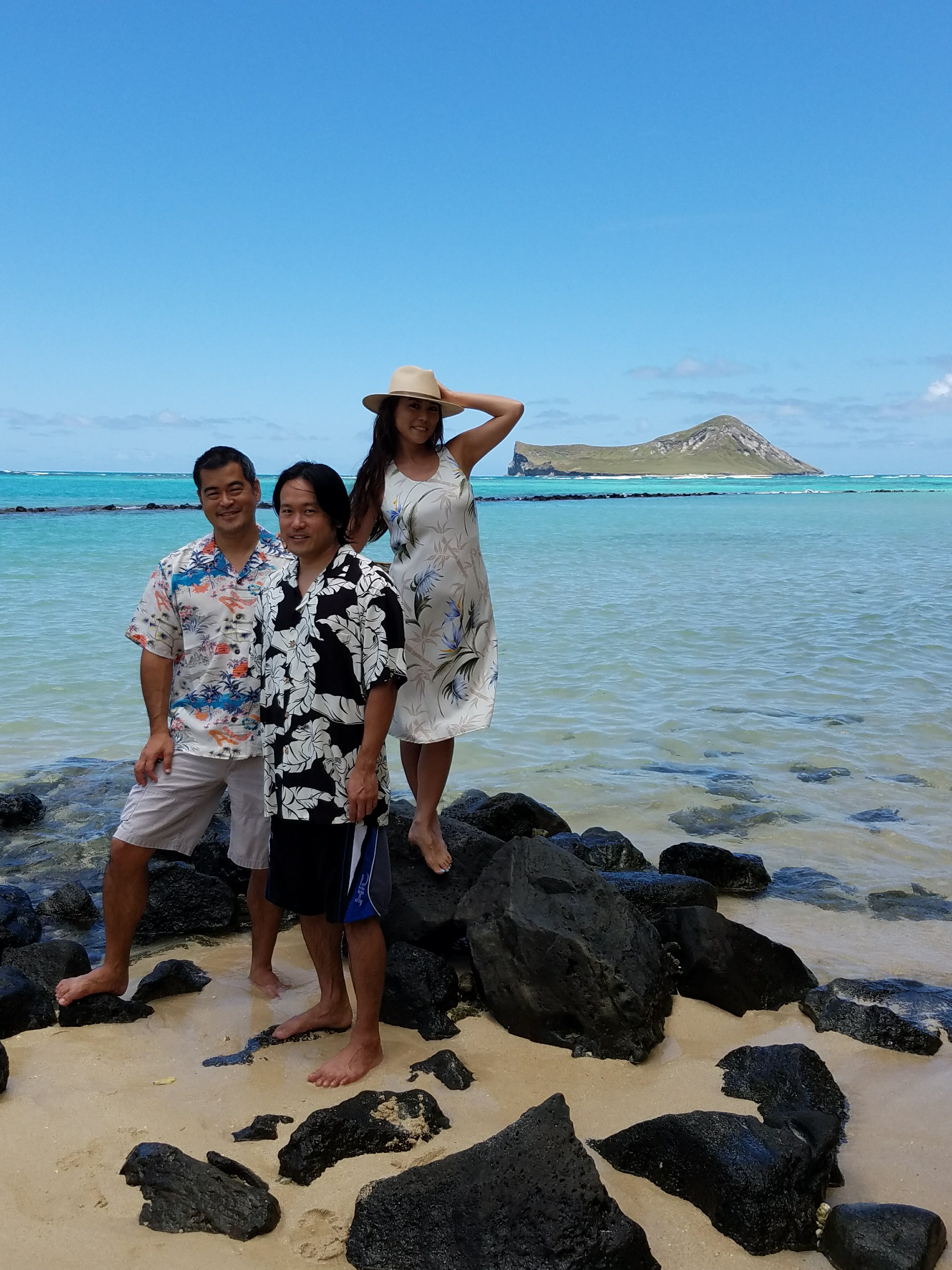 Aloha attire worn for Aloha Fun Wear at http://www.alohafunwear.com on 5/19/2017 at Waimanalo, Hawaii. Aloha Fun Wear has a lot of fun and comfortable Hawaiian style clothing.