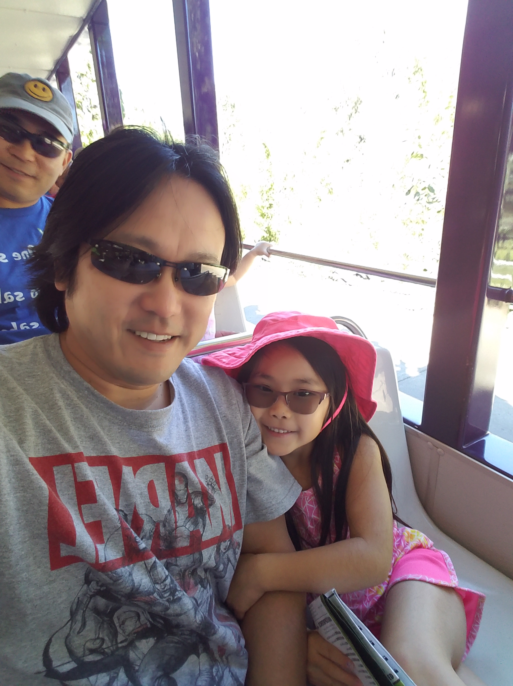 My niece and I riding the open-air bus at San Diego Zoo on 10/17/2018 in San Diego, California. My brother-in-law is behind us, my niece’s dad.